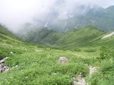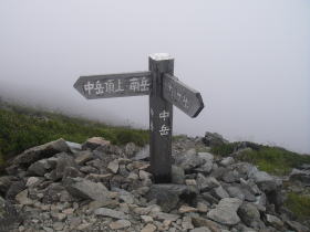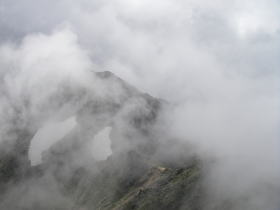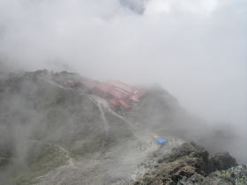 | 南岳小屋に着いた後も霧が次々とできる状態で、キレットを見ることはできませんでした。 |