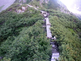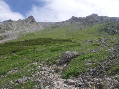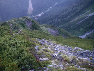 | ガレ場の急斜面を下った後、尾根に上がり下るコース。尾根上には木道もある。 |