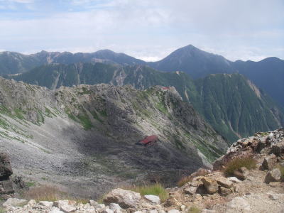 | 飛騨乗越から尾根の反対側を覗くと殺生ヒュッテ、ヒュッテ大槍が見え、その先に常念岳が見えた。 |