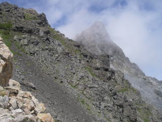| 飛騨乗越からは、霧に霞んでいるが間近に槍ヶ岳が見えた。 |