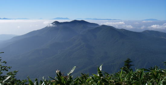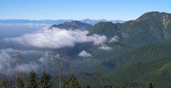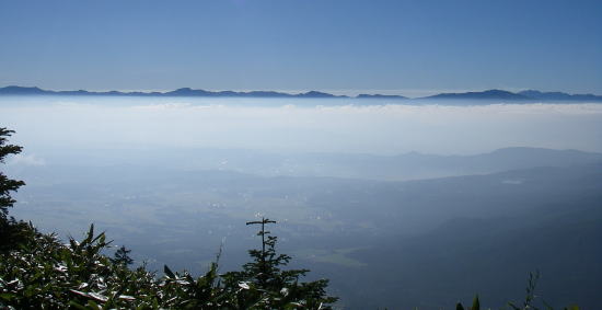 | 分岐からは新道を辿り、樹林帯を抜け展望の開けたところに『しらたま平』という道標があった。2.5万図に1998と記されている地点の近くらしい。雲海が広がり、雲海に浮かぶ山並みの眺望が素晴らしかった。 |