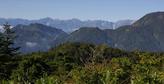 | 戸隠山と高妻山。背景は鹿島槍ヶ岳、五竜岳、唐松岳など。 |