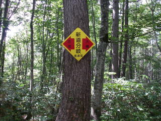 | 登山口から新道分岐までは、林道沿いの山道を歩いたり、林道のように広い道を歩いたりする。ここは西登山道との交差点にもなっている。 |