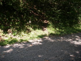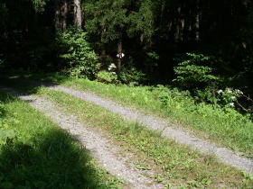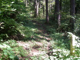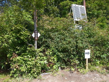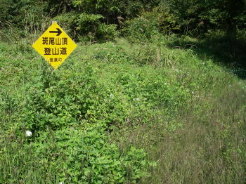 | 登山道は林道を3回横断し、1回目と3回目に横断するところには1,2台とまれるスペースがありました。でも2台とまっていると後から来る車はUターンするのに苦労しそうです。 最初に林道を横断するところまでは道に草が生えていてあまり歩かれているようすはありませんが、横断した後の登山道は地面が見える普通の登山道です。つまり私が歩き始めたところから登る人は少なく、最初の林道を横断するところまで車で来て登る人が多いということのようです。 |
