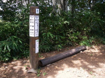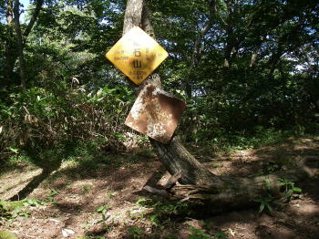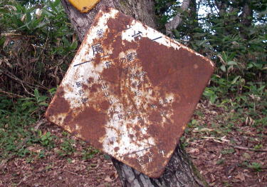 | 釜石山。山頂は樹木に囲まれ展望はまったくないが、古い道標には釜石山展望台と書かれており、飯綱山、戸隠山、焼山、火打山、妙高山、赤倉温泉、池ノ平、野尻湖などが見えると書いてある。 釜石山の道標には標高1020mと書かれているが、2.5万図で見る限り1100mを越える稜線上に位置しているので、もしかしたら釜石山というのは別の場所にあったのかも知れない。道標も釘で木に打ち付ける形式で随分古いもののようだ。 |