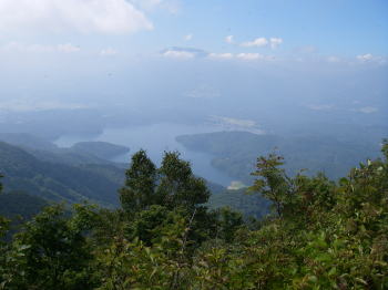 | 大明神岳。今回歩いたコースでは唯一の展望の利く場所。野尻湖が見えた。斑尾山の山頂には『眺望バツグン。野尻湖が見える!』という大明神岳に誘う案内があった。 |