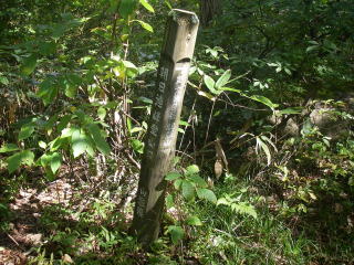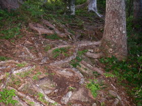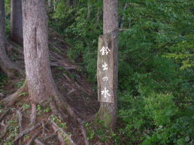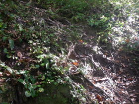 | 登山道はこのように木の根のステップになっていたり、藪を刈った後の地面がそのまま出ているところが多く、人工的なステップや土留めはほとんどなかった。全般的に踏み跡が薄いようだ。鈴出の水というのは尾根上にあり、近くに水がありそうな地形ではなく、水場に行くような分岐も見あたらなかった。 |