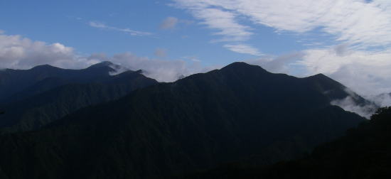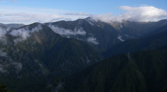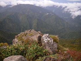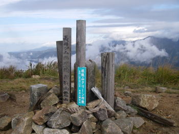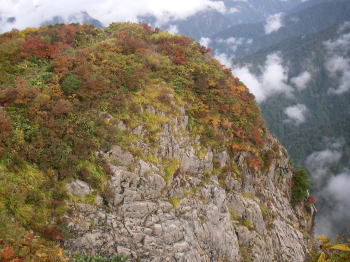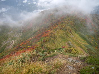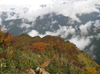 | 前日の二王子岳と同様に明け方に雨が降り、止むのを待って出発しました。天気の回復は早く、ちょっと雲がかかっていましたが朝日連峰を見ることができ、また山頂付近では紅葉を楽しむこともできました。 |
