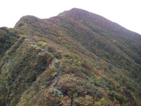 | 一ノ塔から見る祝瓶山。逆光気味で暗く写っているが紅葉がだいぶ進んでいるのが分かった。 |