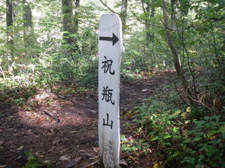 | 吊り橋を渡った後も朝日連峰登山口という道標が目立ちますが、この祝瓶山への分岐の道標を見て安心しました。 |