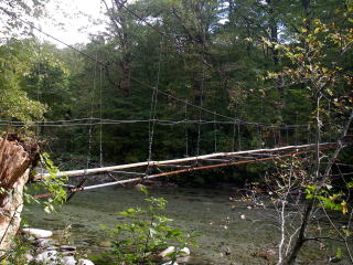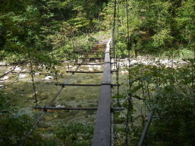 | 登山口を発つとまずこの吊り橋を渡ります。板は一人が歩けるだけしか付いていません。このようにしておけば雪の降る時期にも板を外さなくても大丈夫なのかも知れません。また一度に渡る人数を制限しなくても自ずと限られた人数しか渡らないのかも知れません。 |