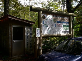 | 大石橋登山口にある小さな小屋が登山者カード記載所。この前に6、7台程駐車できるスペースがある。この50m程手前にも10台ほど止まれる所がある。 前日にここに来ましたが、途中にも、ここにも祝瓶山という道標はなく、朝日連峰登山口という道標だったので心配しながら来ました。写真にある看板の地図を見ると現在位置と祝瓶山が近いので安心しました。 |