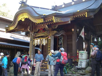 | 出発してから1時間ほどで加波山神社親宮に到着。親宮下の広場で豚汁作りが始まり、係の人以外は加波山山頂の加波山神社親宮に向かいます。 |