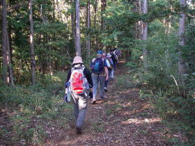 | のどかな山道を長い列を作って進む。アケビを見つけて採る楽しみもあった。 |