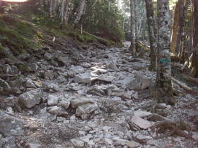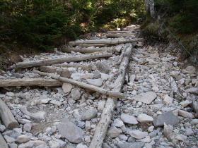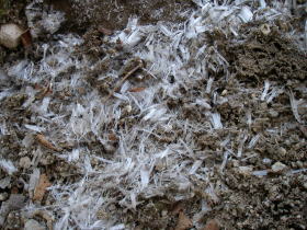 | 登山口から将軍平の間の多くはガレ場の道だが、崩れやすいところは丸太で流れ止めをしてあるのと石の大きさと形のせいか、歩くときのステップは安定していてとても歩きやすかった。泥交じりのところは霜柱で固まっていた。写真は道脇の泥の斜面の霜柱。 |
