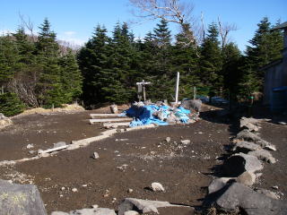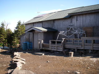 | 将軍平の蓼科山荘。山荘前の広場は霜どけでどろどろになっていた。 |