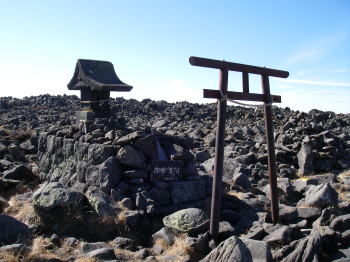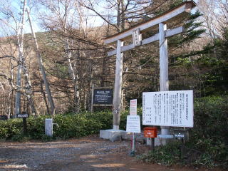 | 七合目登山口の鳥居と駐車場。11時頃に到着したときにはこの駐車場は満車だった。だがちょっと離れたところにある大きな駐車場には1台も止まっていなかった。11月のウイークデイでもこれだけの車が止まっているのだからシーズン中は大混雑なのだろう。 |