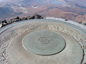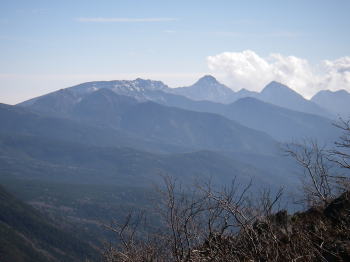 | 山頂から見る八ヶ岳。山頂に着いたのは昼過ぎだったせいか、天気は良かったが遠くの山はだいぶ霞んで見えた。 |