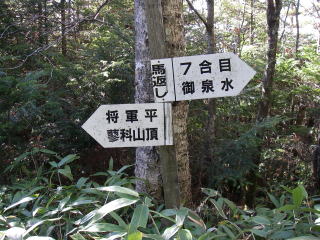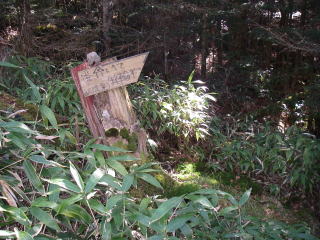 | 馬返しの道標。新しい箕輪平への道標もあるが、藪に覆われ道らしいものは見えなかった。 |