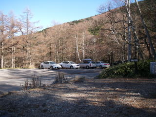 | 七合目登山口に戻ってそのまま宿に行くとチェックイン時間には早すぎるので、御泉水自然園で時間つぶしをすることにする。だが自然園は閉まっていたので、カラマツの落ち葉の積もった遊歩道を歩いたり、コーヒーを沸かしたりしてから、女神湖畔のペンション『スノーバード』に行く。 |