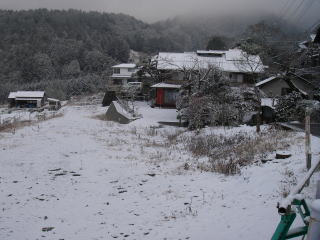 | 上野原駅でも雪は降っていたが、バスを待っている間にやんだ。だが登山口に近い井戸のバス停ではこのような雪景色だった。 |