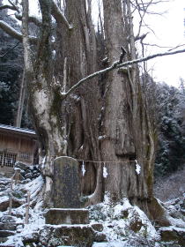 | 軍刀利神社を過ぎ、更に進むと奥之院があり、そこにある『大桂』。ここから山道に入る。 |