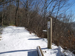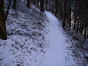 | 景信山で少し休んでから小仏に下るつもりで歩いたが、バスのダイヤの関係で急いでいたのと、雪に残っていた足跡に惑わされ、小仏への分岐を見逃し東尾根に入り込んでしまった。私の地図には東尾根には登山道はないが実際はけっこうはっきりした道があり変だなと思いながらもどんどん進んでしまい、最後には急坂を下って中央高速道に着いてしまった。登り返して日影への分岐の道標のあるところまで戻り、東尾根を歩いていたことが分かったがそれまではまったく気づかなかった。その道標には私が間違った方向に日影への近道と書き加えてあり、日暮れには時間があったので小仏への道へは戻らずに、東尾根をもう一度歩いて日影に下る道を探すことにする。しかしなかなか見つからず手間取ったが、かすかな踏み跡を見つけ日影に着いた。 歩きやすい新雪だったのと何度か歩いたことのある小仏へ下る道だったので調子に乗りすぎて早足で歩いたのが失敗のもとだった。 |