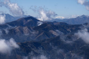 | 三国山からの眺望。中央右の雪をかぶった山は赤石岳、小赤石岳。 |