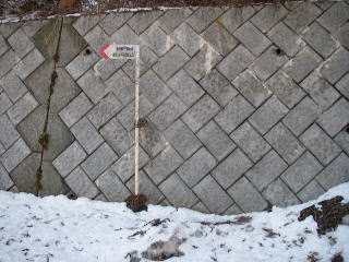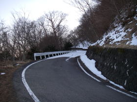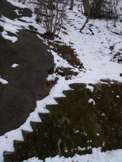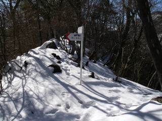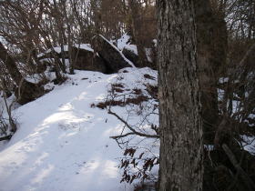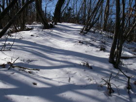 | 山道は一旦林道に出て、林道を左手に50mほど進むとまた山道に入る入口がある。雪はだいぶ深そうだなと思いながら踏み出すと林道の縁にたまった雪に膝までもぐってしまった。あわててスパッツを着ける。 |