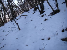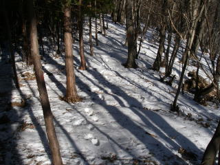 | 林道から上は雪が多くなったが、人の足跡は雪融けにより消えてしまったらしく、ところどころにかすかな足跡らしきものが残っているだけで、シカやイノシシらしい足跡が目立ちました。角研山に近づく頃には気温が高くなって雪がゆるみ足が雪にズボズボと入りラッセルのようになったところがあり、スノーシューを持ってくれば楽なのにと思いましたが後の祭りです。 |