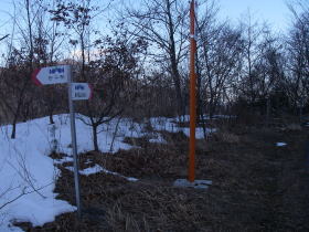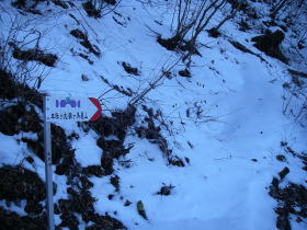 | 下降点に立つと50mくらい離れたところに道標が見え、行ってみるとその道標は初狩を指し示していました。林道を越えると雪は少なくなり、ルートを外す心配をせずに初狩駅に着きました。 |