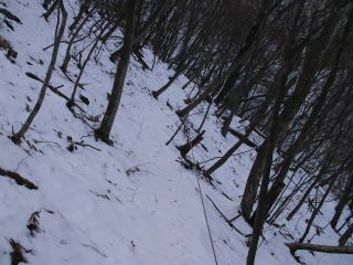 | 鶴ヶ鳥屋山から初狩に向かう道は尾根沿いの道ですが黒野田林道が近づき尾根から外れるところにはロープが張ってあったので間違わずに済みました。足跡はほとんど残っていなかったのでロープがなければ間違っていたかも知れません。 |