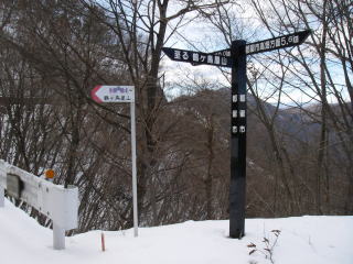 | 笹子駅前を南にちょっと進むと鶴ヶ鳥屋山へのこの道標がある。だが予定していたコースとこの道標の示す方向とは違うので、雪にタイヤの圧雪痕のある林道を逆方向に10分ほど歩くと鶴ヶ鳥屋山への道標があり、そこから山道に入った。 |