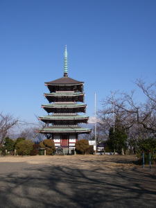 | 車道に出ると間もなく香陵台に着く。お寺の境内らしくはないが五重塔があった。朝の散歩に来ている方がけっこういて、こんな快適な散歩コースが身近にあるのは羨ましい。 |