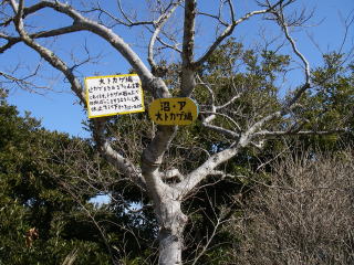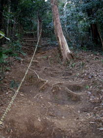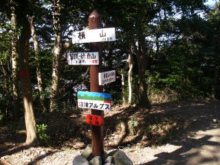 | 八重坂峠からの登りは急で虎ロープが張ってある。一旦緩やかになったところには中弛という地名のある道標があり、その後もまた急坂で、ここにも虎ロープが張ってあった。ここを過ぎると横山に到着。 |