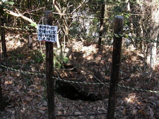 | 戦時中の『対空壕』 崩落して危険なので近づかないように綱が張ってある。防空壕という言葉は知っているが対空壕というのは初めてだ。対空というからには飛行機を撃つ兵器があったのだろう。 |