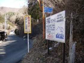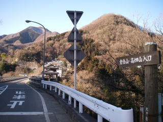 | 梁川駅から国道20号に下りると、改札口の真下辺りにこの倉岳山、高畑山入口の道標があった。この道を15分ほど歩くと登山口がある。 駅の近くや人家の多いところで登山口への道が分からずうろうろすることが多いので、今回は一安心。 |