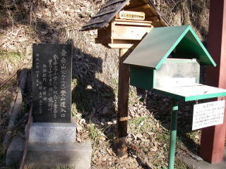 | 倉岳山の登山口。登山者名簿を提出できる箱、倉岳山周辺の案内図、『乳房恋ふ 母にも似たる 倉岳を 里の子今日も 胸に焼き付け』と歌の書かれた道標などがあった。 |