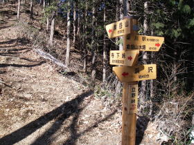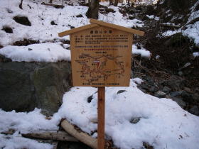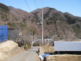 | 立野峠から浜沢への下りは南斜面のため雪が少ししかなく、立野峠への登りのように滑る雪道をおっかなびっくり歩くようなことはなかった。 |