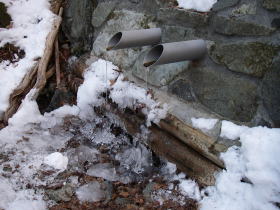 | 立野峠まであと15分程の所にある水場。水流の下に育った石筍のような形の氷の中央が温かくなった水でえぐられてコップのようになっていた。こんな所にも春が近いことが感じられる。 |