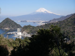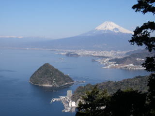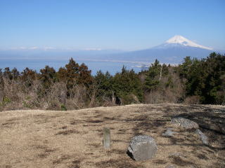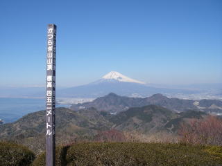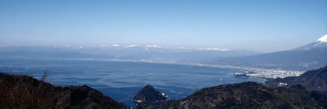 | 発端丈山では海越しに富士山や南アルプスを見ることができました。南アルプスは遠くにあるため詳細は見えませんが、富士山の左に北岳から光岳までの峰々が雪をかぶって連なり、その更に南にも白くはありませんが延々と山が連なっているのが見えました。葛城山からも同じように見えました。 |