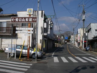 | 岩間駅の正面の通りを5分も歩かないうちに『愛宕山参道入口』の道標があり、車道を案内しているものかも知れないと思いながら見ると、下に小さなハイキングコースと書いた道標もあった。 |