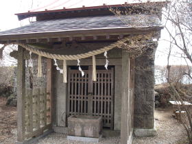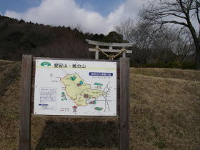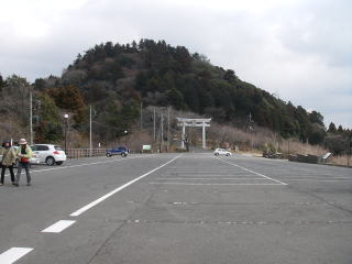 | 山頂から石の階段を下ると鳥居があり前は大きな駐車場になっている。鳥居の背後に見えるのが愛宕山。 |