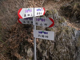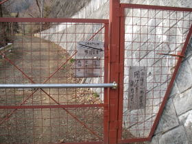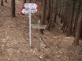 | 鳥沢駅から国道20号を八王子方面に進み、この道標に従って曲がるとすぐにJR中央線のガードをくぐる。その後、道標に従って進むと林道のゲートに着いた。ゲートは車専用ではなく、鹿柵のように山の動物にも備えたもののようだ。 |