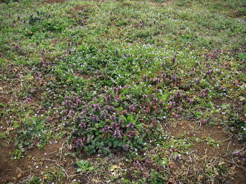 | 上野原の畑の脇のイヌノフグリの群落。ヒメオドリコソウも沢山あった。 住宅地にはいると庭先や道ばたにたくさん花があった。春真っ盛りといった風情。 このあたりの山の春も間近のようだ。 また高柄山の山頂では、休んでいた方に教えられ太陽の周りの虹をほぼ真上に見ることができた。全周ではなかったが弧の大きさは角度にして80°くらいだった。太陽からの直接光のため写真は撮れそうもなかったのであきらめた。 帰宅後調べてみると日暈というものらしい。話には聞いたことはあるが見るのは初めて。 |