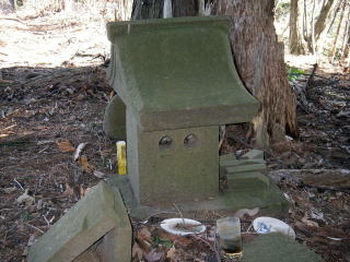 | 登山口から丸太作りの階段を上がったところにある石祠。先日高柄山に行ったとき、上野原の御前山で見たものと同じハート形の窓がある。 |