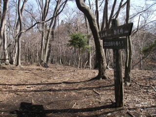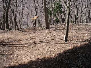 | 二つ目の不動尻分岐 大山へのルートを進むと、尾根が急勾配で下がるところがあり、ルートが見つからずうろうろした。よく見ると尾根が三つに分かれていて、中央の尾根が正しいルートだが、小さい尾根で、樹木に遮られ尾根らしく見えなかったせいだ。 ルートが分かれば歩くのが困難なところはなく、この二つ目の不動尻の分岐に着いた。これから先は歩いたことがある道なので一安心。 |