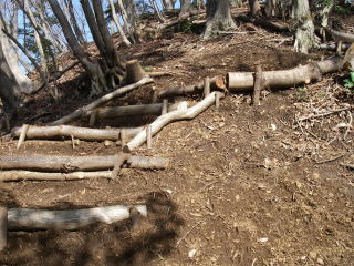 | 煤ヶ谷から三峰山に登り、広沢寺温泉に下ったことは何度かありますが、三峰山から尾根づたいに大山に行くコースは歩いたことがなかったので行ってみました。なだらかで幅の広いところがある尾根なので分かりにくいところもありましたが、歩くことができました。ところが辺室山から物見峠に向かう途中で、まったく新しい道があったので登山道を改修しているものと思い、歩いて行きました。すると道を造っている方々がいて、挨拶を交わしながらそのまま進むと、物見隧道に続く林道に下りてしまいました。改修ではなく、新しい道を造っていたのです。こんなわけで全く間違えそうもないところで間違えてしまいました。 |