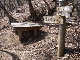 | 不動尻への分岐にあるベンチ。ここで分岐に入らず尾根を直進するのが大山へのルート。 |