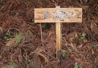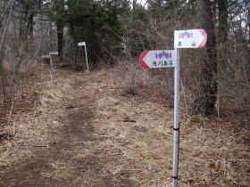 | 山の神と水場のあるところのちょっと上にあった新しい『つつじ群生地入口』を示す道標。その先には『下山』と書かれていて、群生地を通って下山できるルートがあるのかも。 |